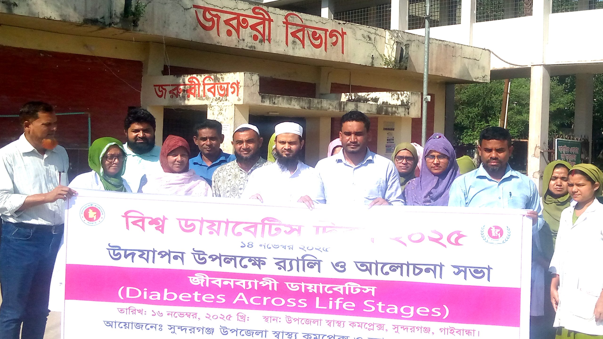 ‘জীবনব্যাপী ডায়াবেটিস’—এই প্রতিপাদ্যকে সামনে রেখে গাইবান্ধার সুন্দরগঞ্জ উপজেলা স্বাস্থ্য কমপ্লেক্স ও ব্র্যাক স্বাস্থ্য কর্মসূচির যৌথ উদ্যোগে বিশ্ব ডায়াবেটিস দিবস উপলক্ষে আলোচনা সভা ও র্যালি অনুষ্ঠিত হয়েছে।