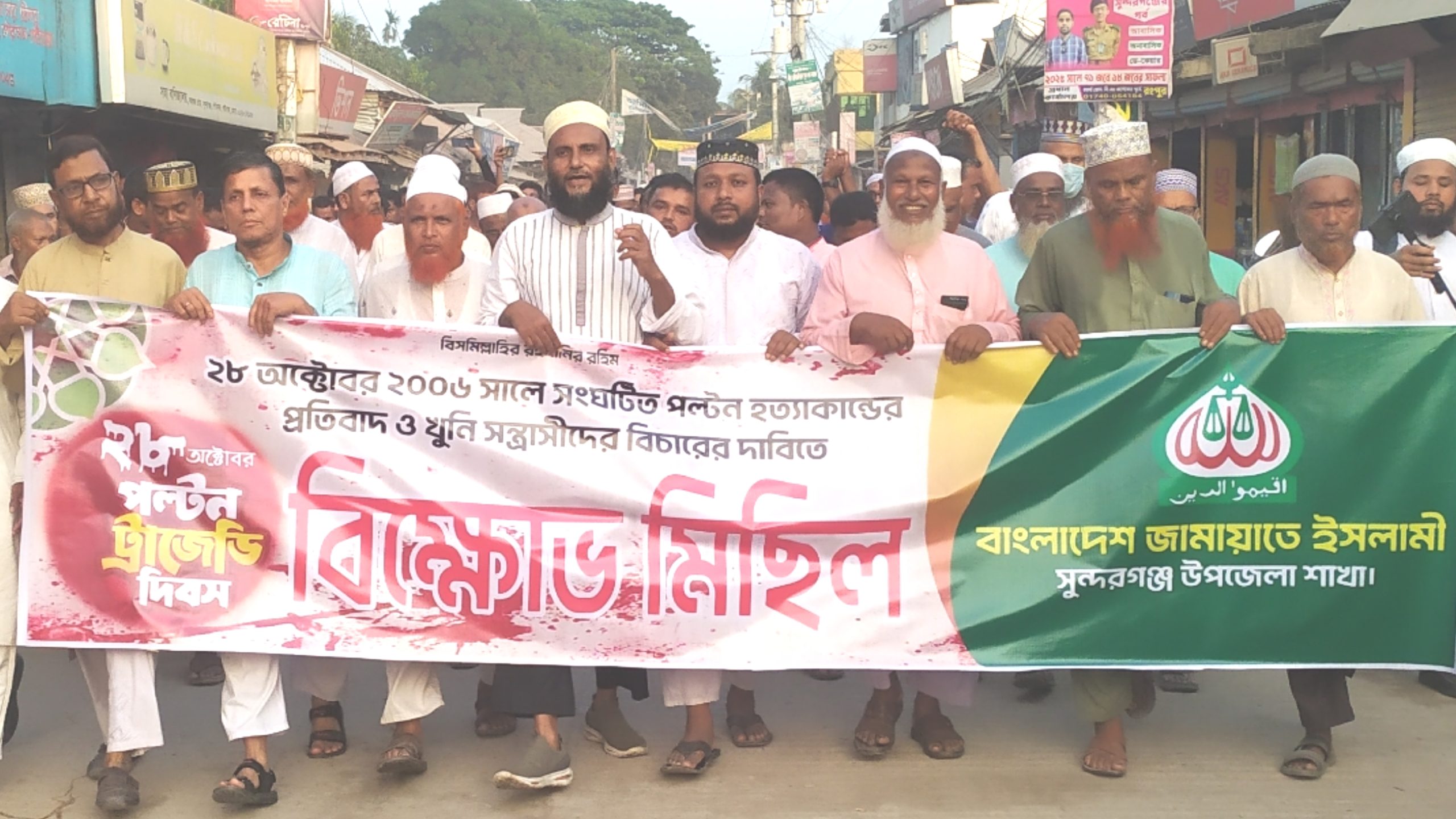 ২০০৬ সালের ২৮ অক্টোবর ঢাকার পল্টন ও বাইতুল মোকাররম এলাকায় আওয়ামী ফ্যাসিস্টদের লগি-বৈঠার তাণ্ডবে সংঘটিত নারকীয় হত্যাকাণ্ডের বিচার ও খুনি সন্ত্রাসীদের গ্রেপ্তারের দাবিতে গাইবান্ধার সুন্দরগঞ্জ উপজেলা জামায়াতে ইসলামী সোমবার (২৮ অক্টোবর) এক বিক্ষোভ মিছিল ও প্রতিবাদ সমাবেশের আয়োজন করে।